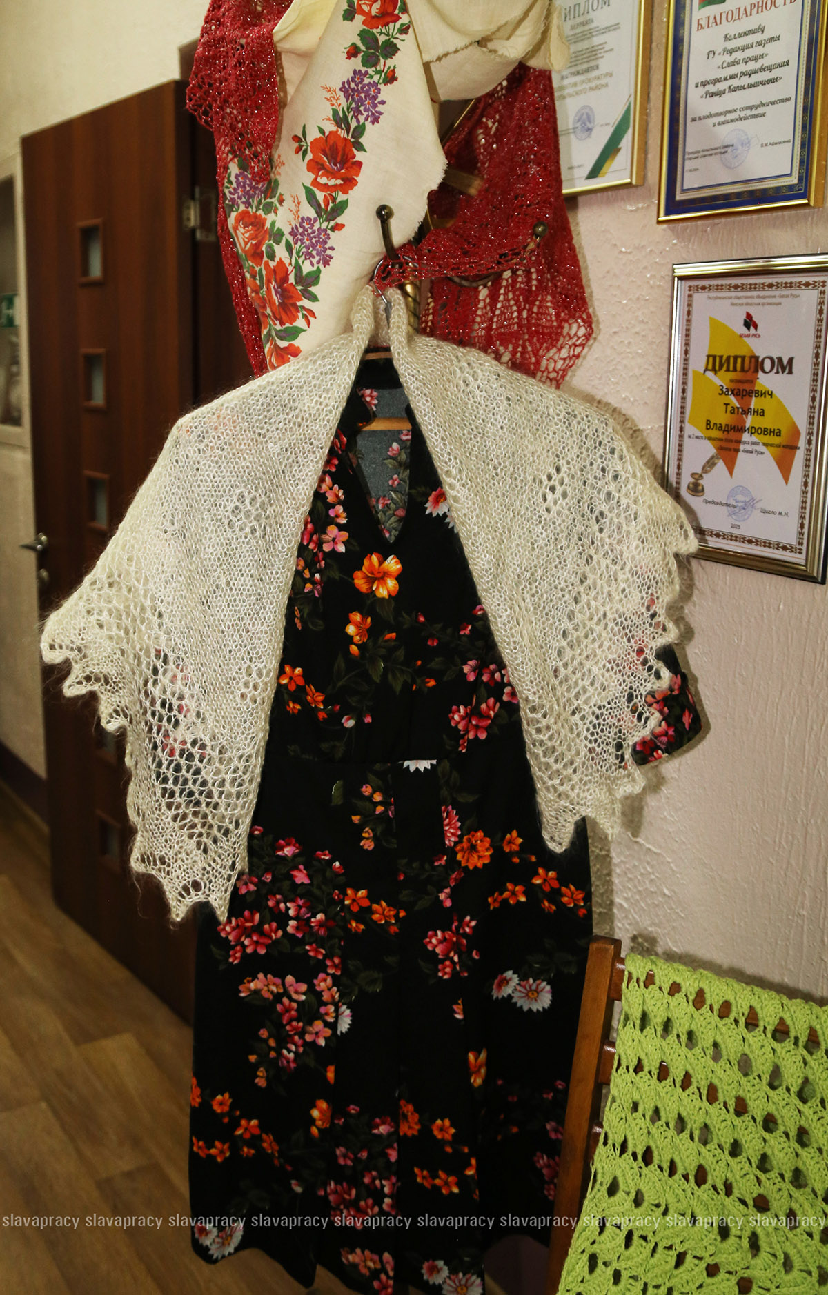 Разнастайнасць экспанатаў, прадстаўленых на нашай іправізаванай экспазіцыі, уражвае. Тут можна ўбачыць і рознакаляровыя, стракатыя, аздобленыя адмысловымі ўзорамі хусткі, і сціплыя, мінімальна ўпрыгожаныя, стрыманыя ўборы. З шэрсці і шоўку, цёплыя і лёгкія, з махрамі і без іх. Некаторыя хусткі атрыманы ў падарунак на вяселле ці дзень нараджэння, іншыя прывезеныя з далёкіх гарадоў ці набытыя ў вясковай краме.
