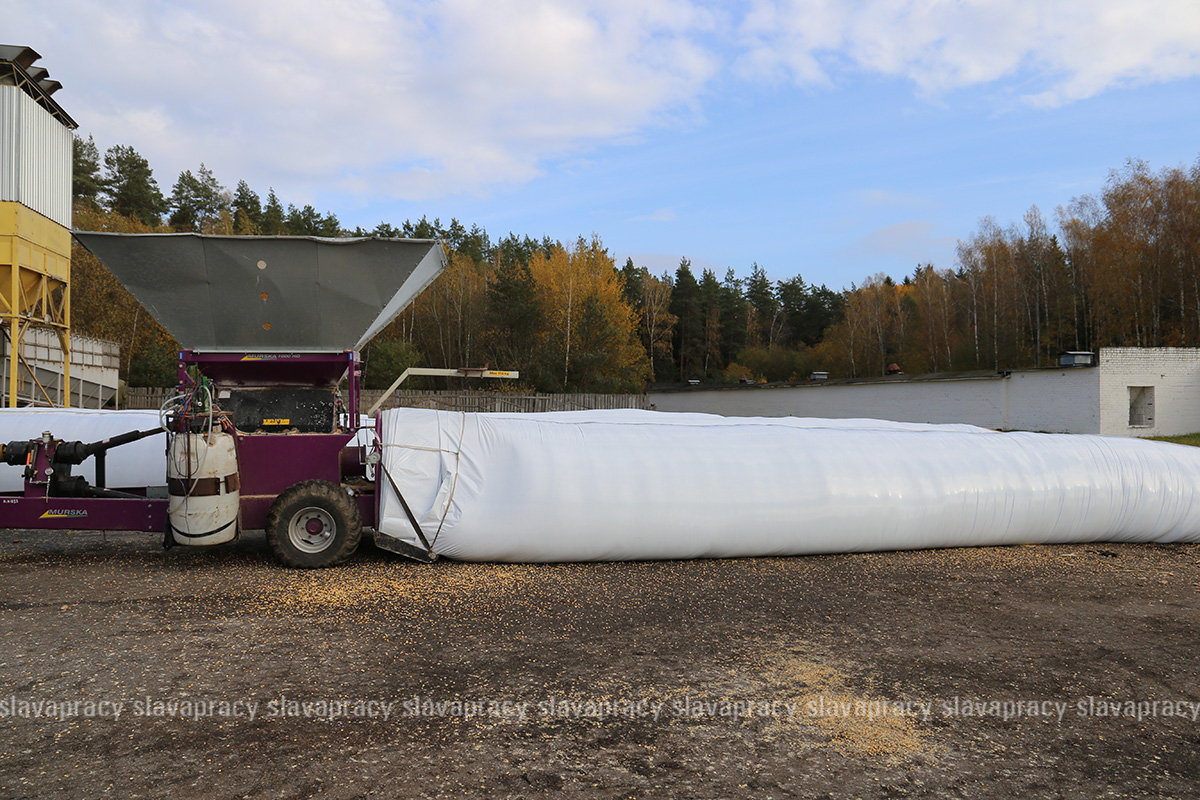 Технологический процесс начинается с плющения зерна при помощи специальной измельчительной техники. Чтобы посмотреть, как она работает, отправились на зерносушильный комплекс сельхозпредприятия, который расположен в агрогородке Лесное. Первое, что бросается в глаза, – длинные, белоснежные рукава. Как пояснил агроном УП «ПИК «Лесное» Сергей Пулинович, именно в них закладывается на хранение плющеная кукуруза. Сюда же добавляются химические консерванты, которые обеспечивают более надежное подкисление заготовленной массы и исключают нежелательные процессы брожения.