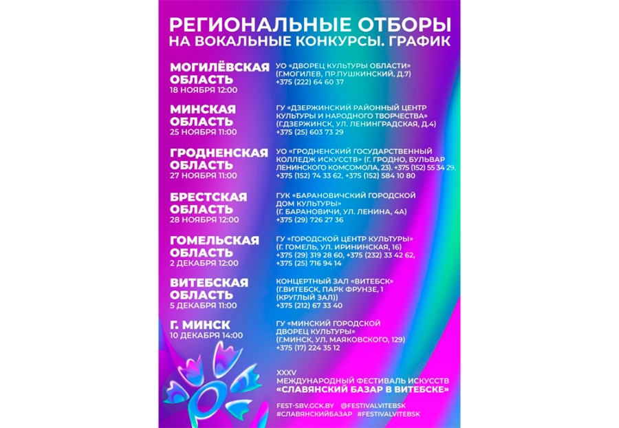 Уточняющие вопросы ЗДЕСЬ (https://fest-sbv.gck.by/news/page/start-regionalnykh-otborov-k-konkursam-slavianskogo-bazara-v-vitebske-uzhe-18noiabria-2025-10-17)