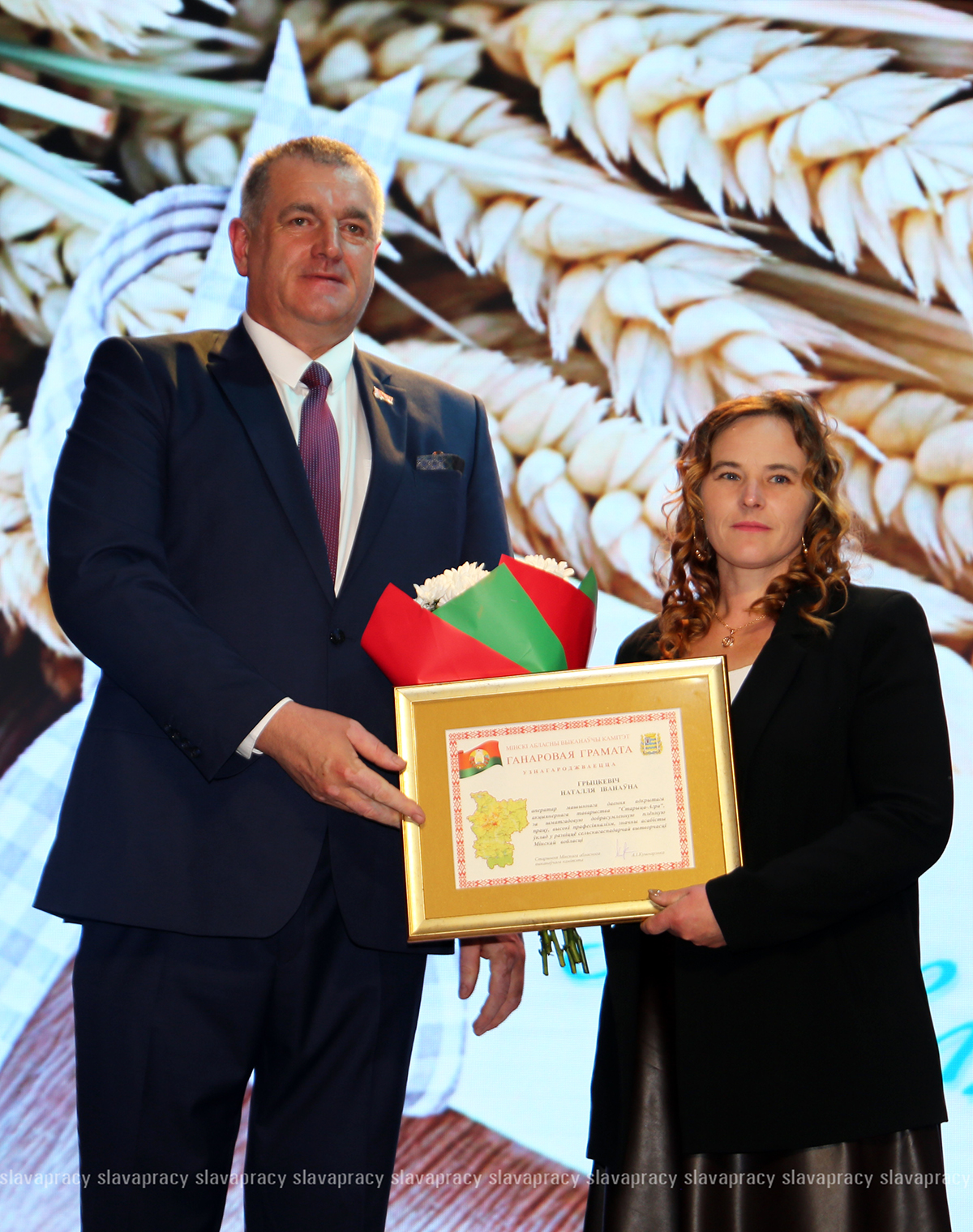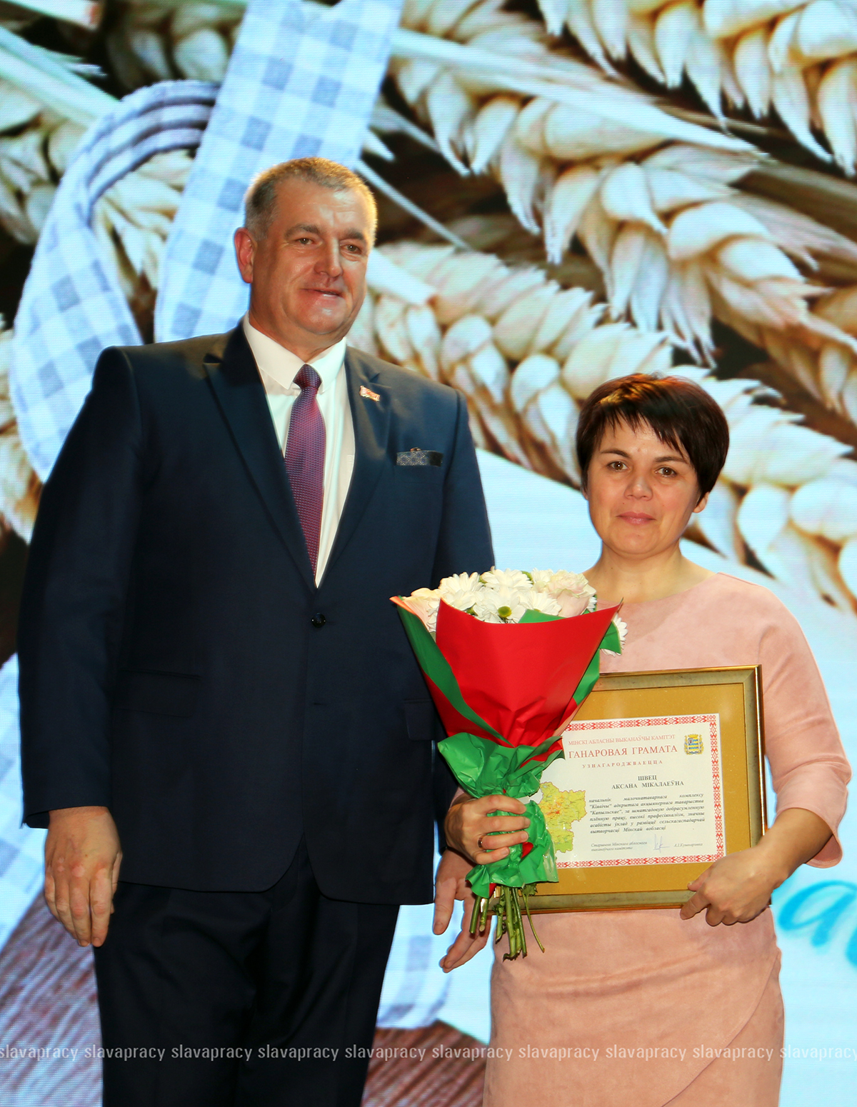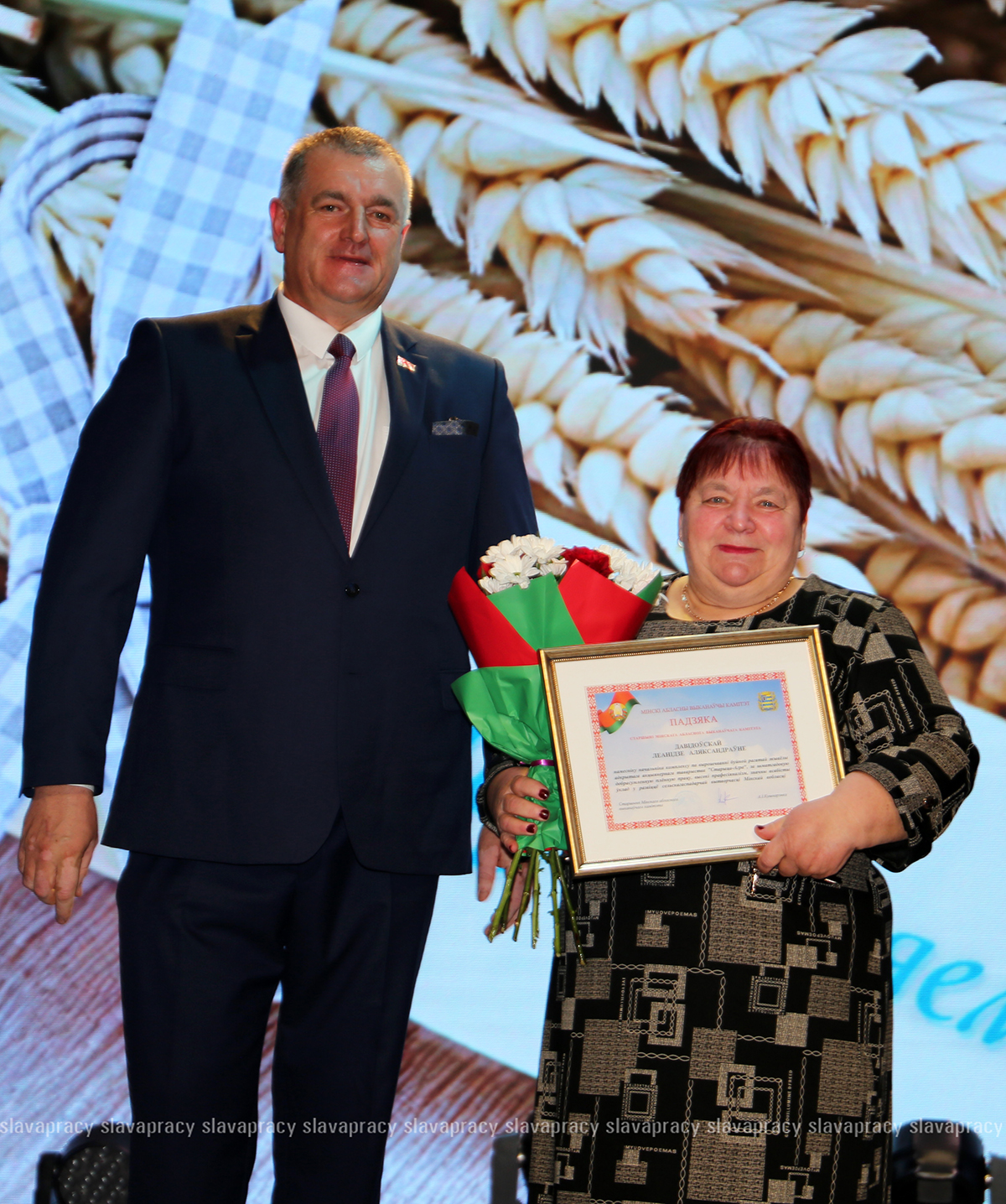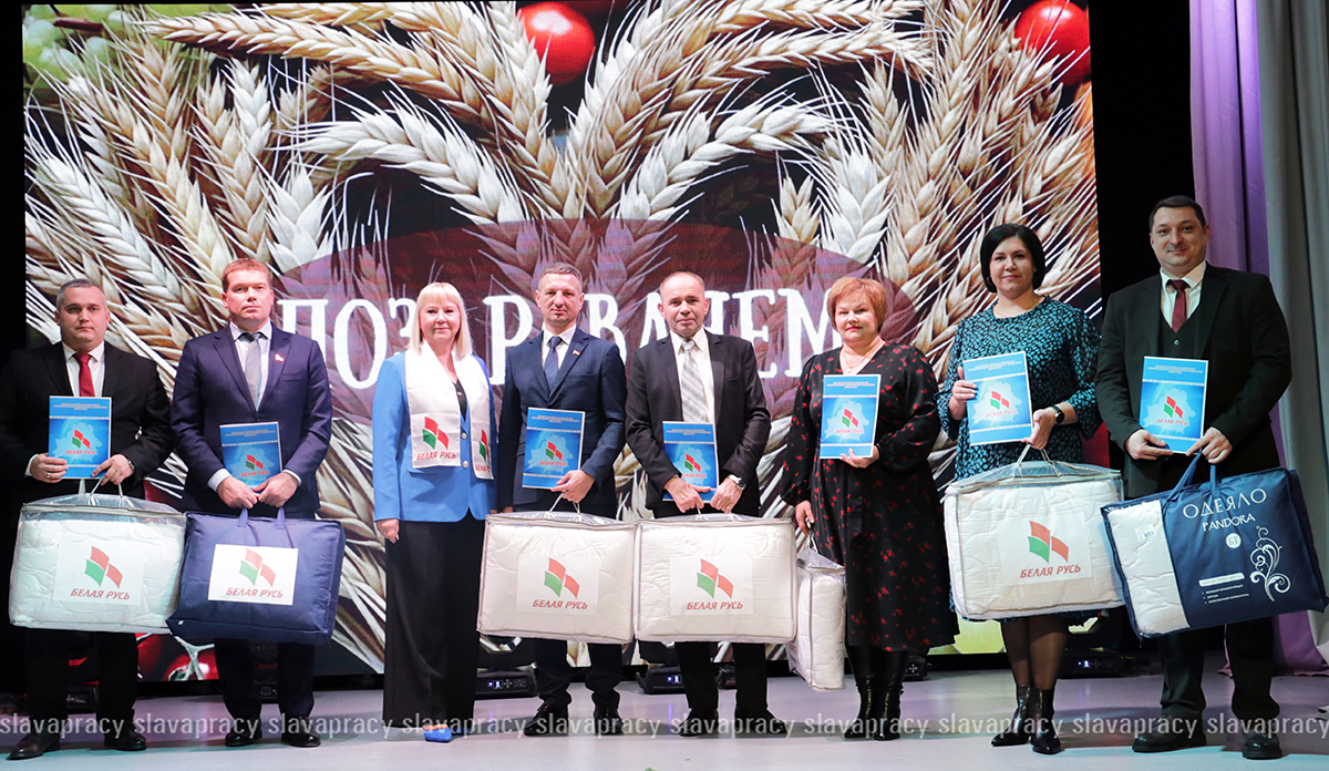 На сцену также была приглашена председатель Копыльской районной организации РОО «Белая Русь» Ирина Абас. Благодарственное письмо она вручила заместителю начальника отдела растениеводства, животноводства и механизации управления по сельскому хозяйству и продовольствию Копыльского райисполкома Татьяне Данченко, заместителю директора по идеологической работе ЗАО «ЖИЛИХОВО» Наталье Провальской, заместителю директора по растениеводству ОАО «Семежево» Юрию Зеньковичу, директору ОАО «Тимирязевский» Сергею Галко, директору УП «ПИК-Лесное» Леониду Бутевичу, директору филиала «Лакнея» УП «ПриортрансАгро» Петру Юхо, директору ОАО «Преснаки» Владимиру Лазовскому, директору ОАО «Семежево» Юрию Тарасевичу.