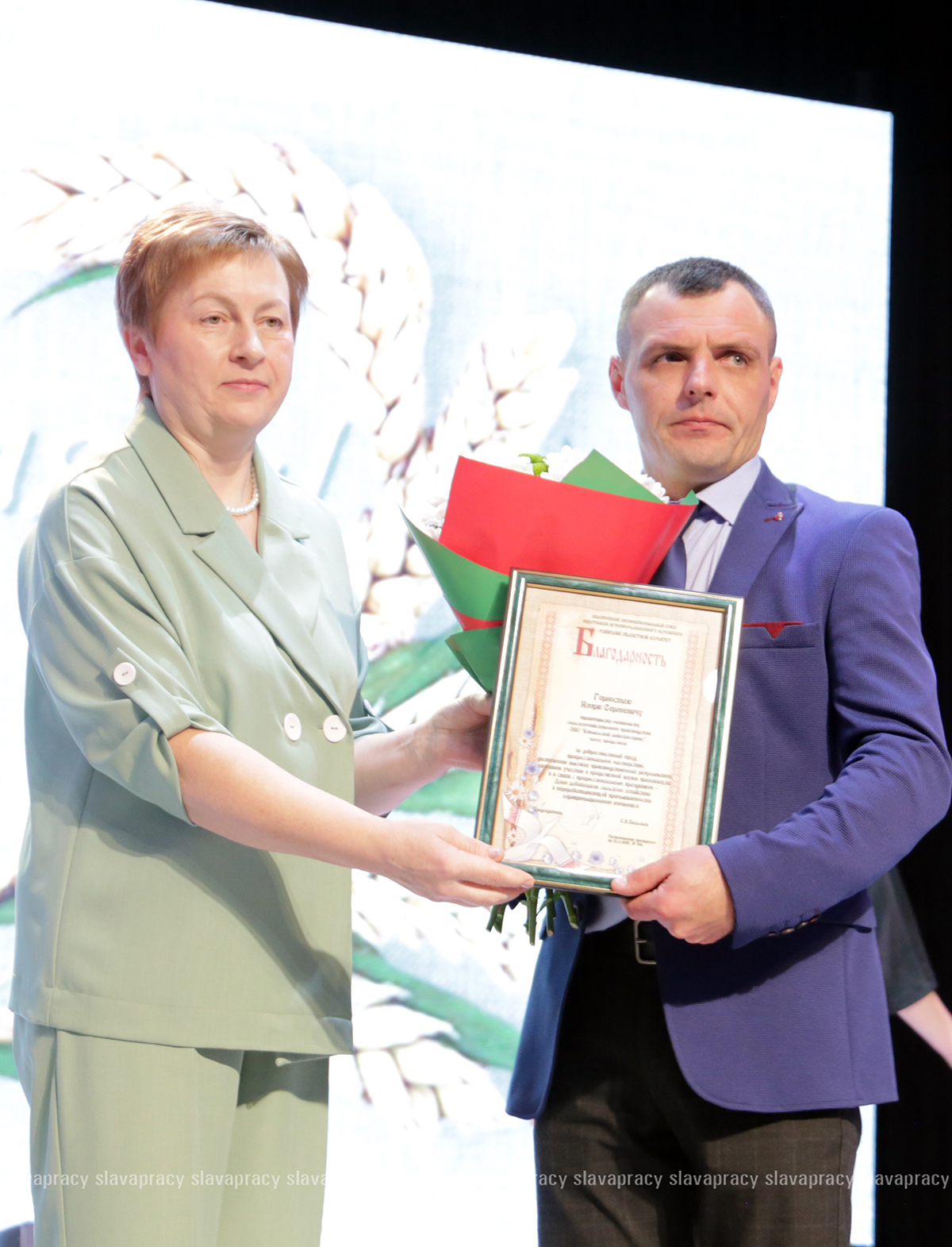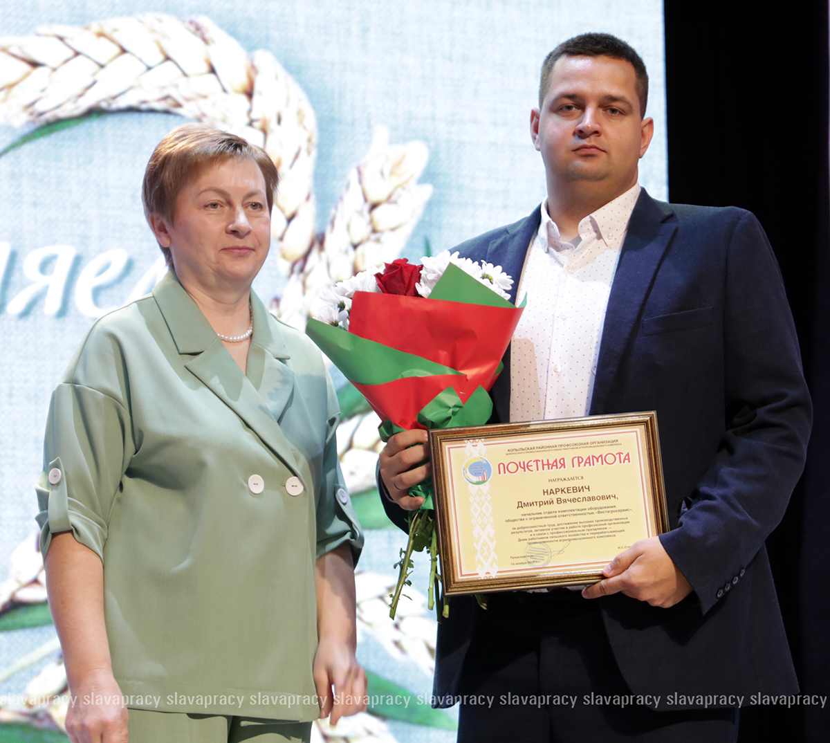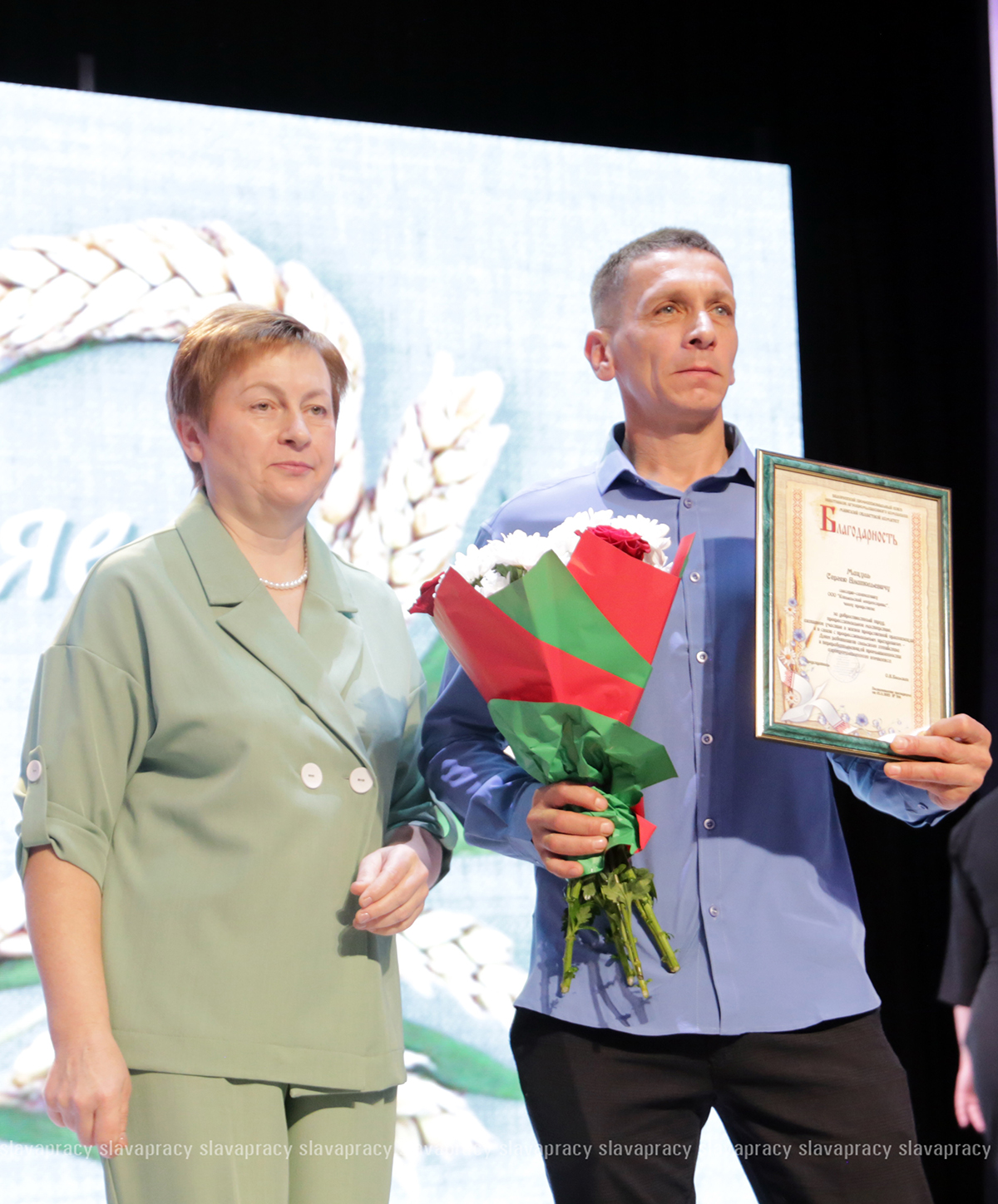 На сцену также была приглашена председатель Копыльской районной организации РОО «Белая Русь» Ирина Абас. Благодарственное письмо она вручила заместителю начальника отдела растениеводства, животноводства и механизации управления по сельскому хозяйству и продовольствию Копыльского райисполкома Татьяне Данченко, заместителю директора по идеологической работе ЗАО «ЖИЛИХОВО» Наталье Провальской, заместителю директора по растениеводству ОАО «Семежево» Юрию Зеньковичу, директору ОАО «Тимирязевский» Сергею Галко, директору УП «ПИК-Лесное» Леониду Бутевичу, директору филиала «Лакнея» УП «ПриортрансАгро» Петру Юхо, директору ОАО «Преснаки» Владимиру Лазовскому, директору ОАО «Семежево» Юрию Тарасевичу.