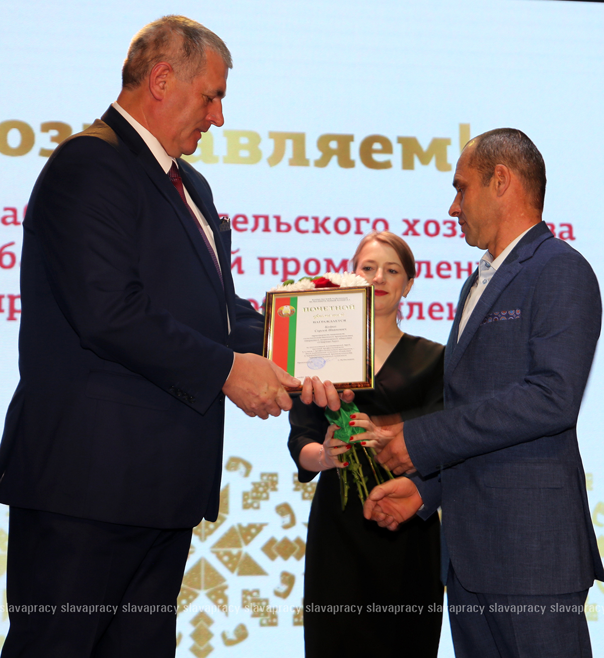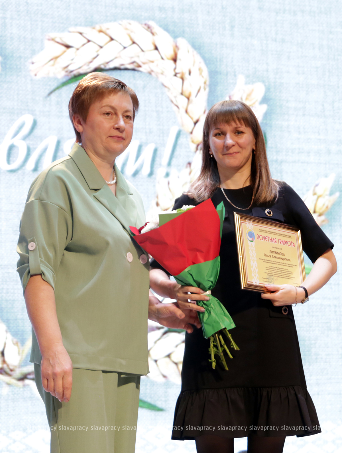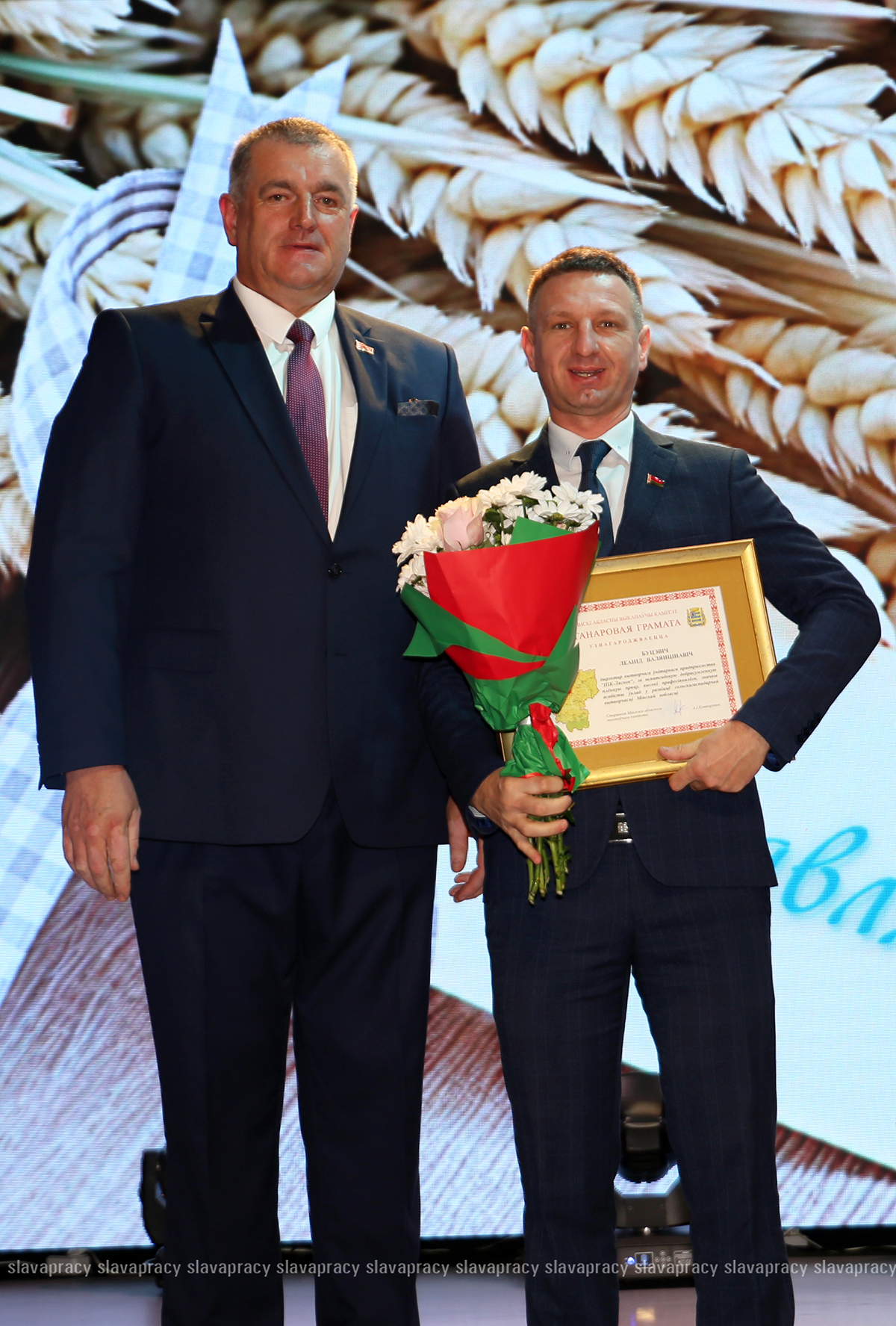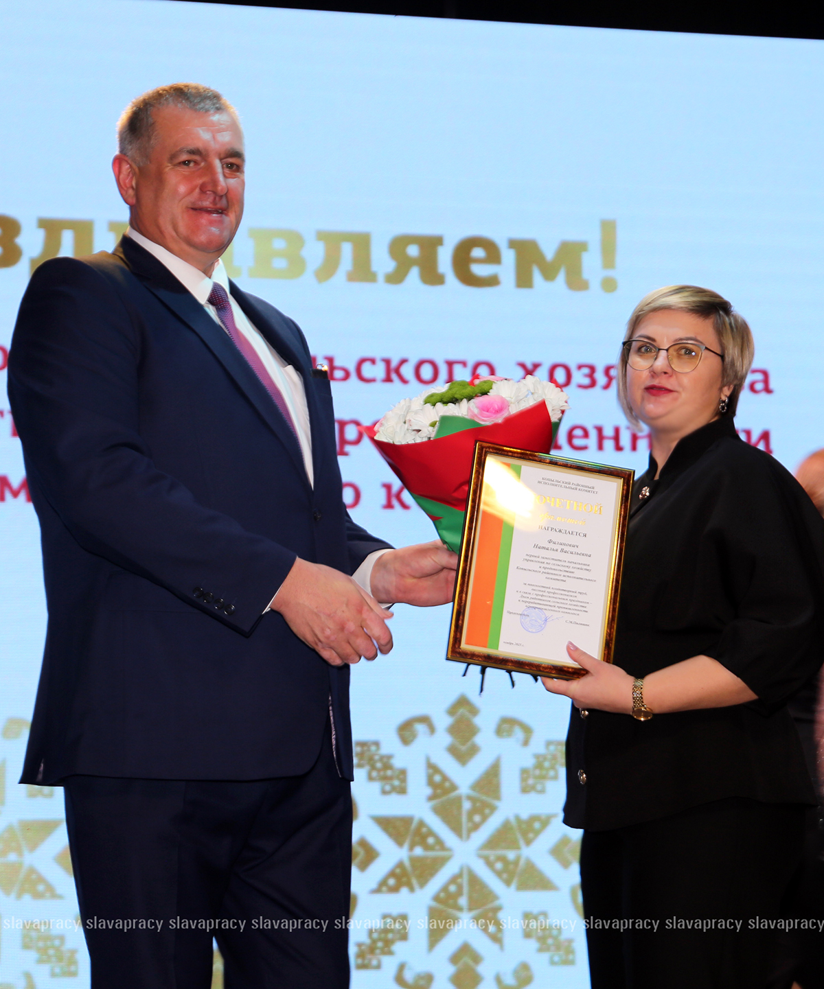 На сцену также была приглашена председатель Копыльской районной организации РОО «Белая Русь» Ирина Абас. Благодарственное письмо она вручила заместителю начальника отдела растениеводства, животноводства и механизации управления по сельскому хозяйству и продовольствию Копыльского райисполкома Татьяне Данченко, заместителю директора по идеологической работе ЗАО «ЖИЛИХОВО» Наталье Провальской, заместителю директора по растениеводству ОАО «Семежево» Юрию Зеньковичу, директору ОАО «Тимирязевский» Сергею Галко, директору УП «ПИК-Лесное» Леониду Бутевичу, директору филиала «Лакнея» УП «ПриортрансАгро» Петру Юхо, директору ОАО «Преснаки» Владимиру Лазовскому, директору ОАО «Семежево» Юрию Тарасевичу.