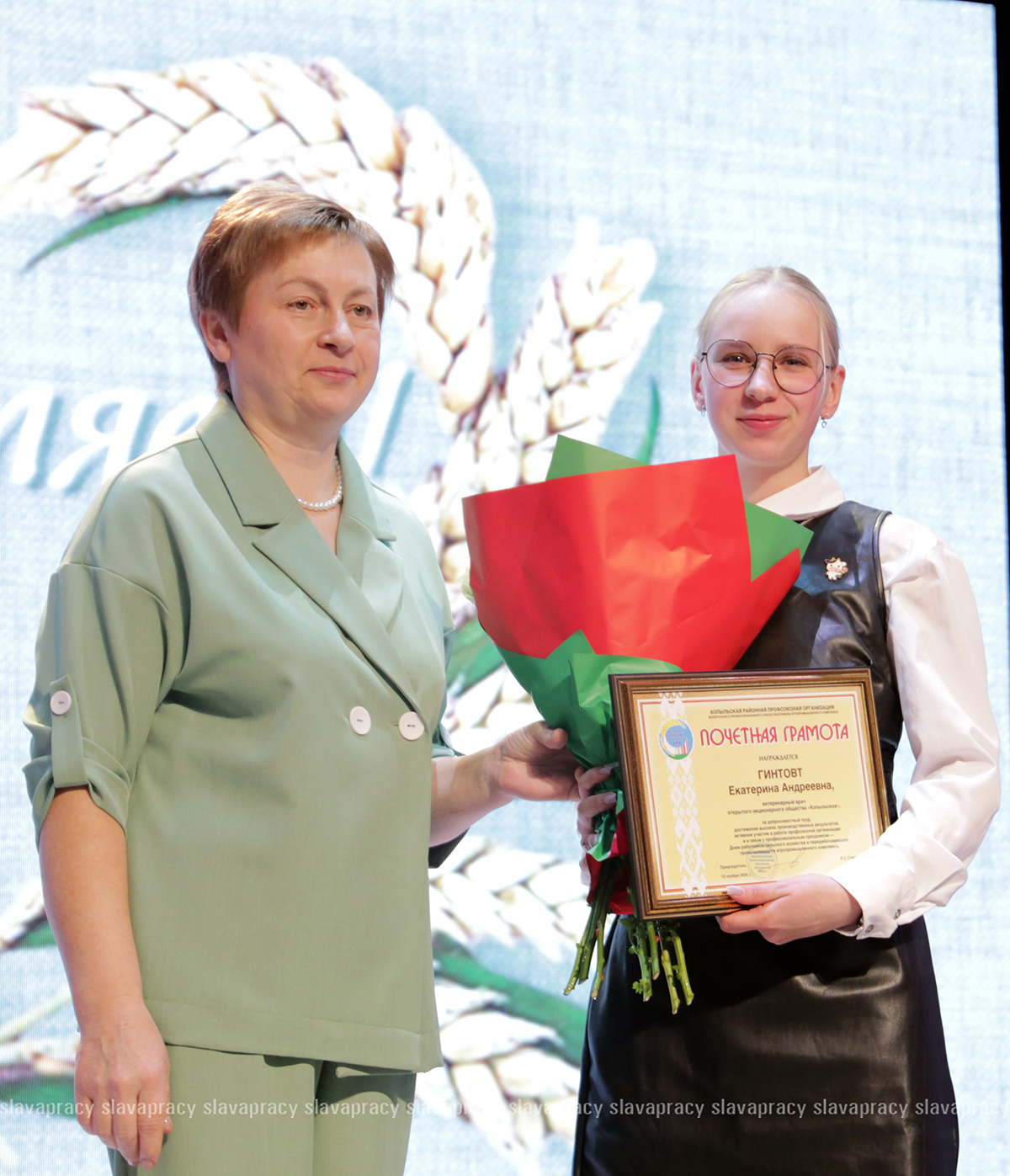 Участие в церемонии награждения приняла председатель Копыльской районной организации Белорусского профсоюза работников АПК Ирина Степуро. Почетную грамоту Минского областного комитета Белорусского профсоюза работников агропромышленного комплекса она вручила заместителю главного ветеринарного врача по диагностике заболеваний ГУ «Копыльская районная ветеринарная станция» Ольге Шиманской, агрохимику ОАО «Тимирязевский» Светлане Лазук. Кроме того, Благодарность Минского областного комитета Белорусского профсоюза работников агропромышленного комплекса объявлена ведущему зоотехнику-селекционеру УП «ПИК-Лесное» Наталье Минец, трактористу-машинисту сельскохозяйственного производства ОАО «Копыльский райагросервис» Игорю Горностаю, слесарю-сантехнику ООО «Копыльский энергосервис» Сергею Мацулю.