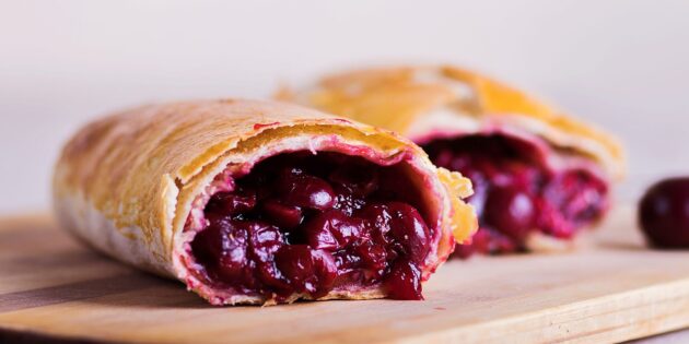 - Накройте ягоды боковыми сторонами и сверните в рулет. Заверните этот рулет во вторую часть лаваша, также смазанную яичной смесью.