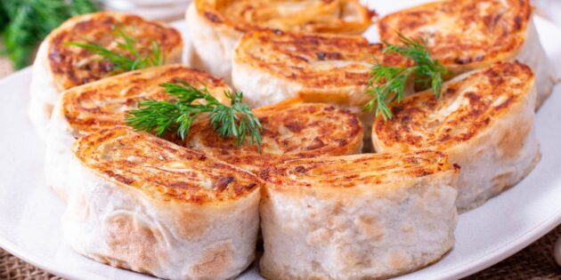 - Скрутите лаваш в плотный рулет, начиная с длинной стороны.