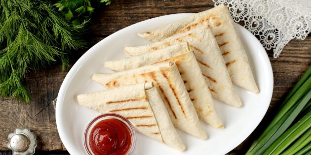 - Загните все края лаваша внутрь, чтобы получился конвертик, и подрумяньте его. Повторите для остальных заготовок.