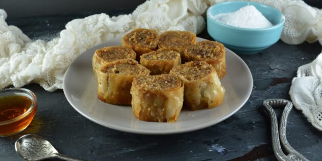 - Полейте лаваш 70 г жидкого меда и посыпьте орехами.