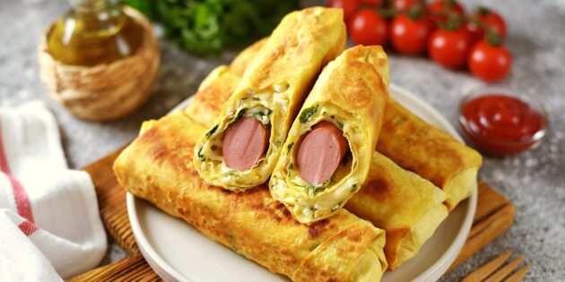 - На одну сторону выложите сосиску, загните боковые края и сверните в рулетик.
