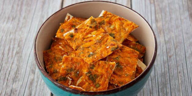 - Сложите лаваш в пакет. Добавьте 2 ст. л. растительного масла, соль, 1 ч. л. паприки, ½ ч. л. куркумы и немного рубленой зелени.