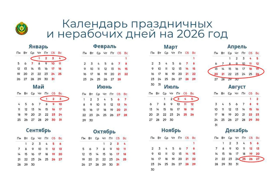 - Январь: 1, 2, 3, 4 января (Новый год).
