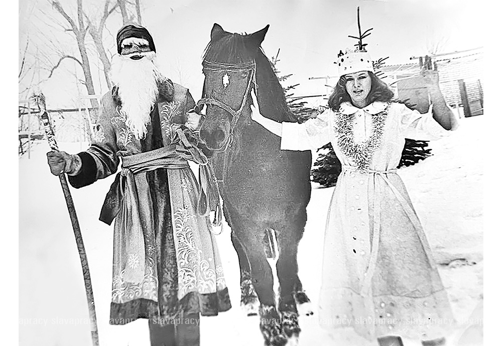Фотография технически проста. Черно-белая гамма, зернистая структура. Но в этой простоте – вся ее сила. Она не кричит о празднике, а тихо рассказывает историю. В центре композиции – лошадь, самая что ни на есть рабочая, из тех, что 25 лет назад были в каждом детском саду и развозили продукты. Слева ее за поводья уверенно держит Дед Мороз. Под ватной бородой и пластмассовым носом – молодое лицо Сергея Новика, тогда учителя кружка по английскому языку детского сада № 5 г. Копыля. В его позе нет театральности, а чувствуется спокойная ответственность человека, который взял на себя роль волшебника и теперь отвечает за чудо. Справа, в пышном полушубке – Снегурочка. Это Наталья Николайчик, тогда еще воспитатель того самого детского сада. Она смотрит в объектив фотографа и машет рукой.