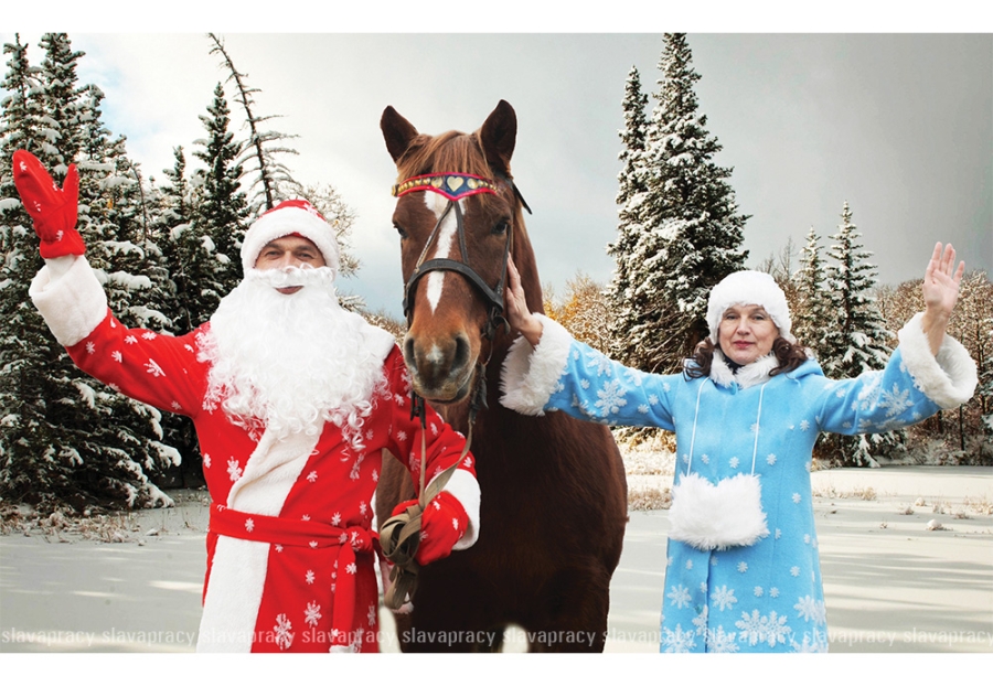 Предложение воссоздать кадр через двадцать четыре года они встретили с легким трепетом, но без колебаний. С радостью и какой-то светлой грустью. Карнавальные костюмы, которые мы позаимствовали в Копыльском РЦК, вновь нашли своих героев. Оставался лишь один вопрос: где найти главного «актера» – лошадь? И на помощь пришло ОАО «Пионер-Агро». Здесь нам предоставили для съемок смирного коня по кличке Василь. Поначалу все шло идеально: Василь мирно жевал сено и благосклонно принимал ласку. Однако появление Деда Мороза в красной шубе и с копной белой бороды внесло коррективы. Конь замер, насторожил уши и сделал шаг назад, явно сомневаясь в благих намерениях сказочного героя. Казалось, съемка под угрозой. Но Сергей Новик не растерялся: сняв теплые рукавицы, он, поглаживая животное, мягко заговорил с Василем, постепенно сближаясь и давая тому привыкнуть к необычному виду. Тихий, спокойный диалог человека с конем сделал свое дело – доверие было завоевано. И после уговоров фотосессия состоялась, а у нас получился отличный кадр для первой полосы.