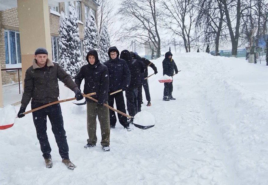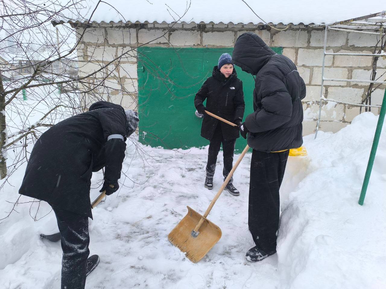 А учащиеся 10-х классов оперативно откликнулись на призыв о помощи и расчистили от снежных завалов двор ветерана педагогического труда — Шаховской Ромы Антоновны.
