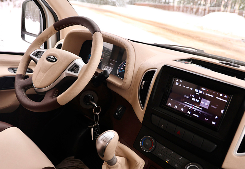 МАЗ заверяет: в этом доме можно жить даже в суровые морозы до –30°C. За климат отвечают кондиционер и два отопителя. Один из них — автономный, способный поддерживать тепло в салоне до 56 часов при заглушенном двигателе. Для контроля за системами создано специальное мобильное приложение, где можно проверить уровень воды и заряд аккумуляторов.