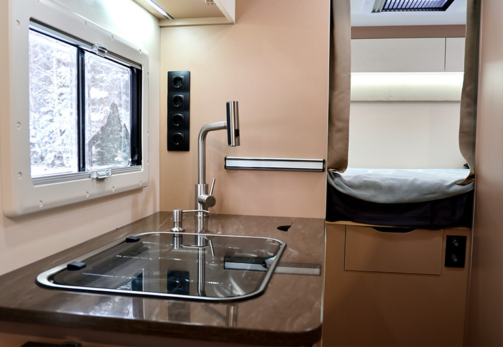 - Кухня: газовая плита, вытяжка, мойка и встроенный холодильник объемом 92 литра. Баллон на 27 литров спрятан в защищенном отсеке.