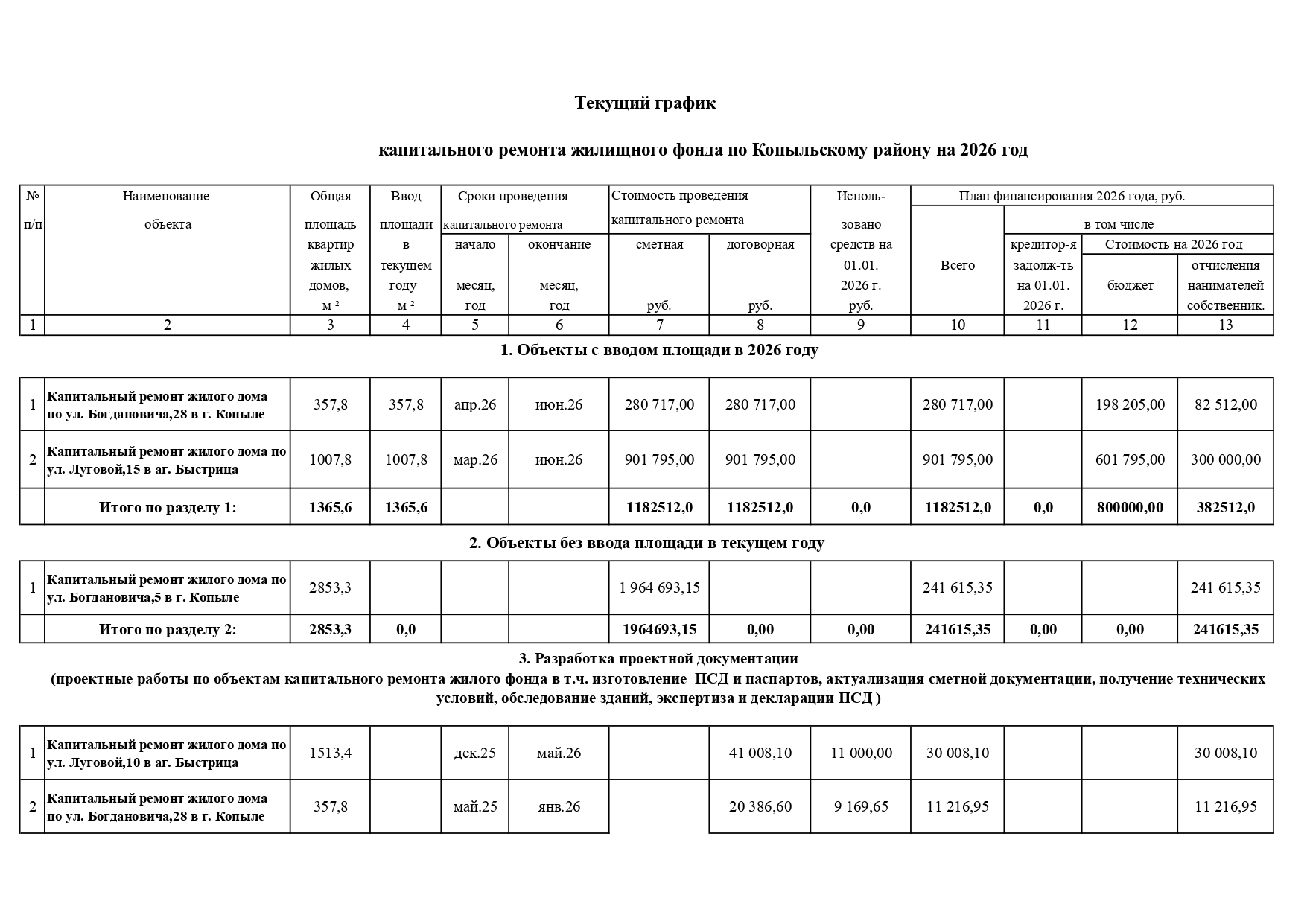 Текущий график капитального ремонта по Копыльскому району на 2026 год