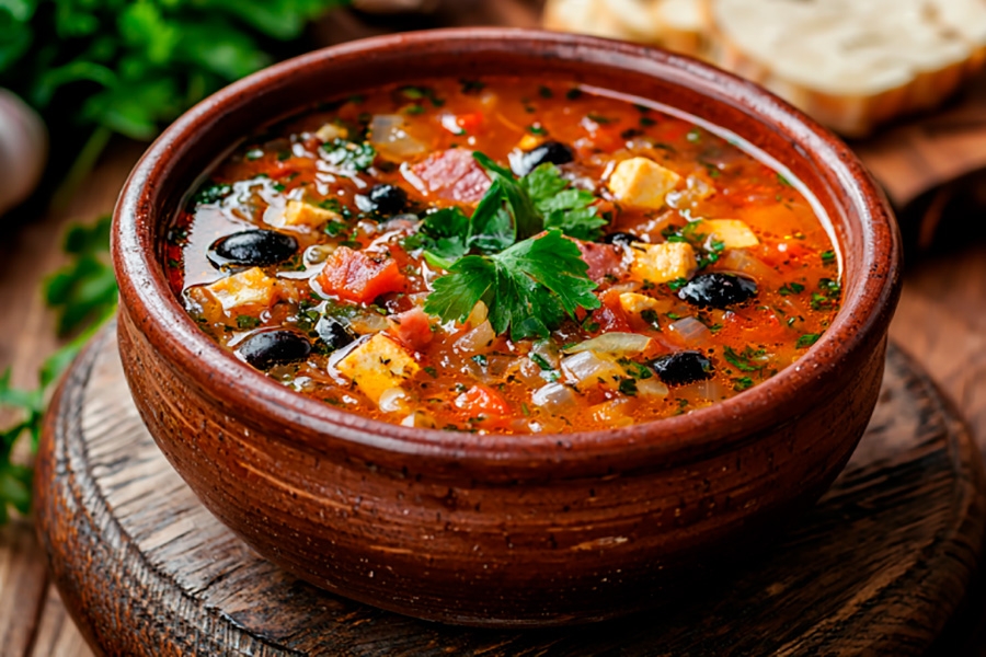 З гатовага булёна вымаем агародніну і мяса. У кіпячы булён адпраўляем тушаную запраўку. Мяса з косткі наразаем кубікамі і разам з каўбасой, вяндлінай, курыцай, маслінамі вяртаем у каструлю. Даём пакіпець тры хвіліны, перчым і выключаем. Самы важны этап – даць салянцы настаяцца 10–15 хвілін.