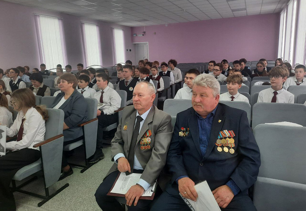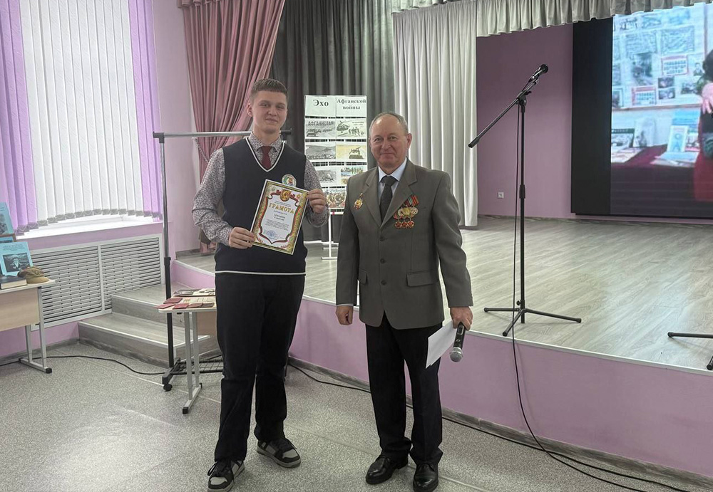 Председатель районной организации ОО "Белорусский союз офицеров" Борис Денисюк и воин-интернационалист Александр Балажинский рассказали ребятам о героизме земляков на афганской земле. Их подвиг навсегда останется в наших сердцах! Они представили выставку фотографий, документов и наград участников боевых действий.