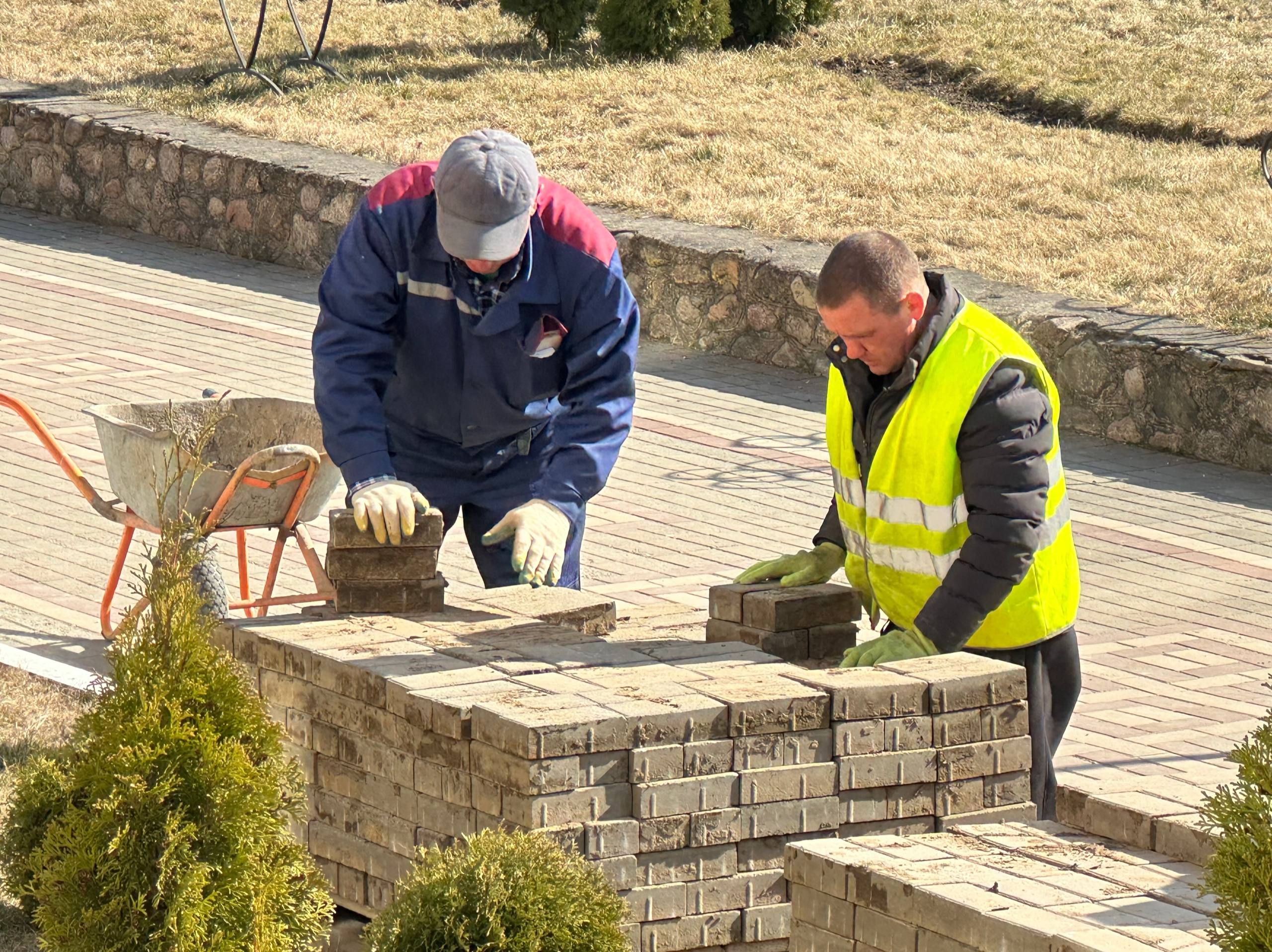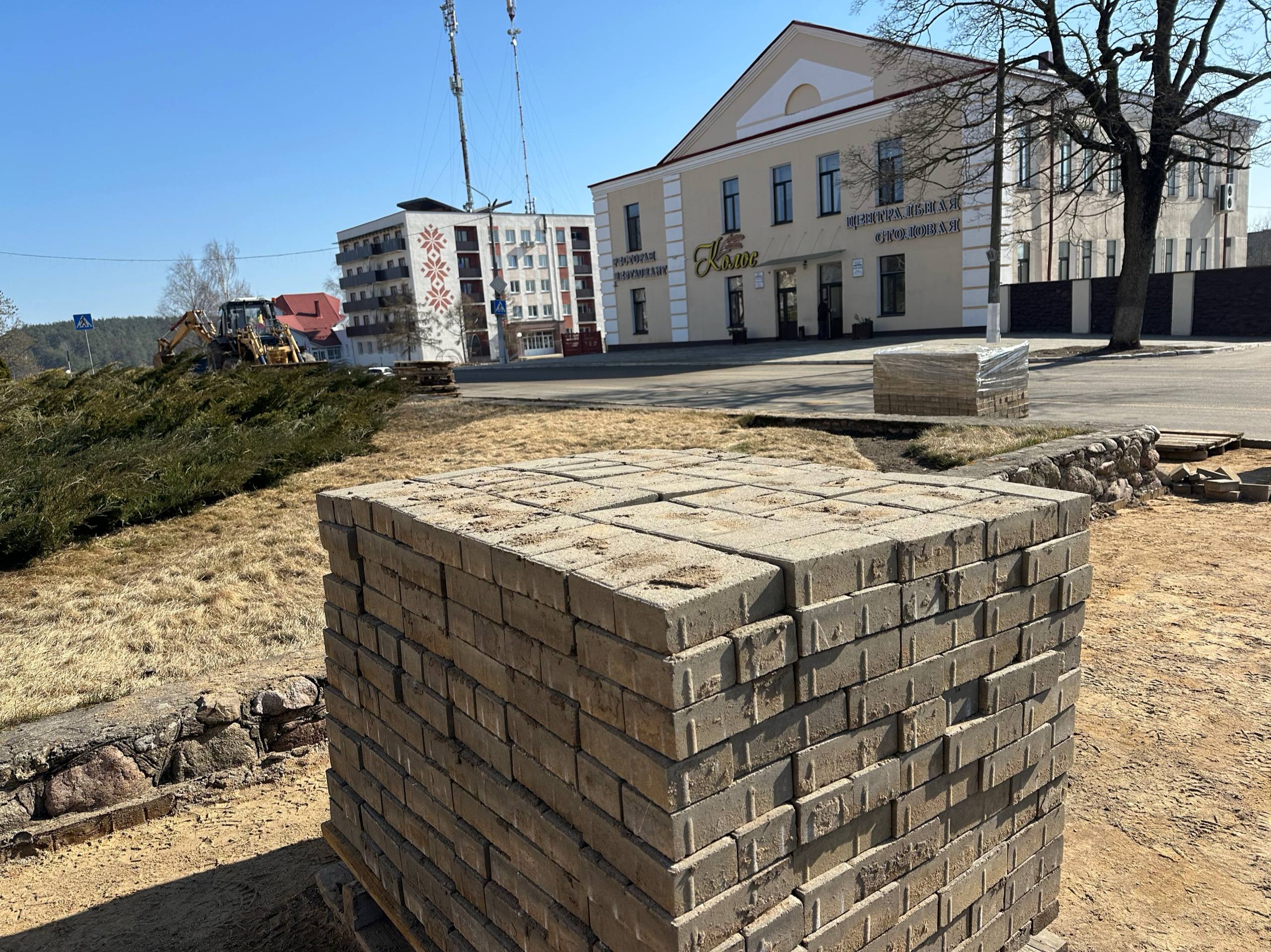 Преображение Копыля набирает обороты! На пешеходных дорожках возле Копыльского райисполкома началась замена тротуарной плитки.
