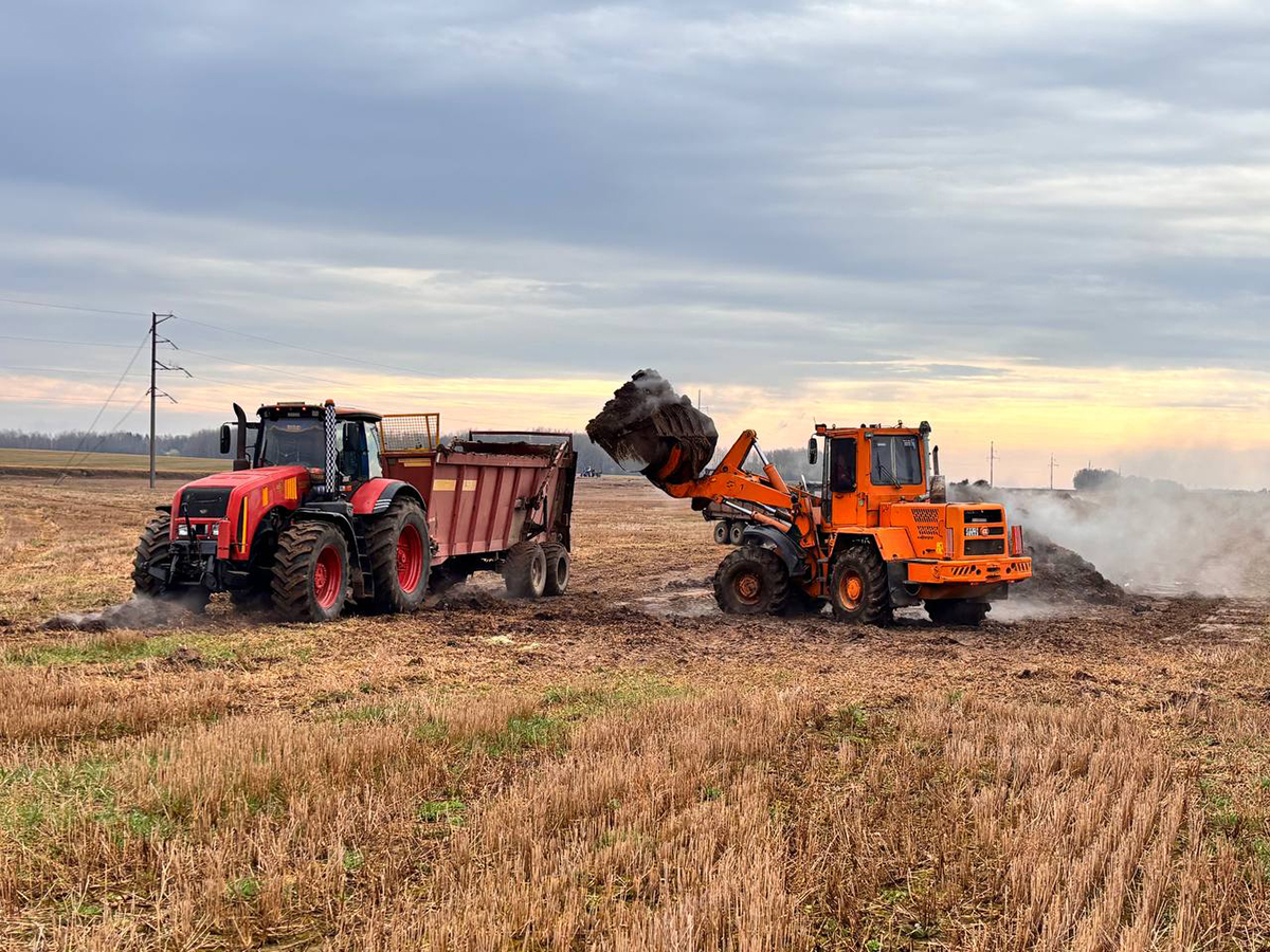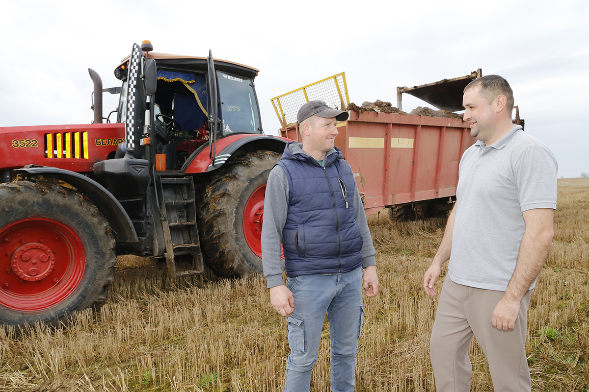 На поле площадью 100 гектаров в урочище Васильчицы кипит работа: аграрии вносят органику под будущий урожай кукурузы. В хозяйстве строго следуют технологии севооборота: предшественником царицы полей здесь выступила озимая пшеница. В процессе задействован целый парк техники из семи машин. Общая задача – внести на поля хозяйства свыше 50 тысяч тонн удобрений. Погрузчик, которым управляет Дмитрий Дитковский, непрерывно загружает удобрения, а в поле трудятся механизаторы Дмитрий Кунцевич, Константин Сакович, Даниил Лобец и Евгений Гудков.