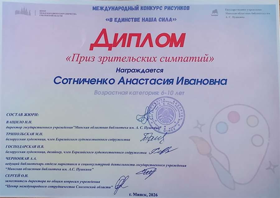 Коллектив Копыльской районной центральной библиотеки им. А. Астрейко поздравляет юную читательницу с заслуженной наградой и желает новых творческих побед! А также благодарит организаторов за возможность юным талантам из Беларуси и России заявить о себе и внести свой вклад в укрепление культурных связей между нашими странами.
